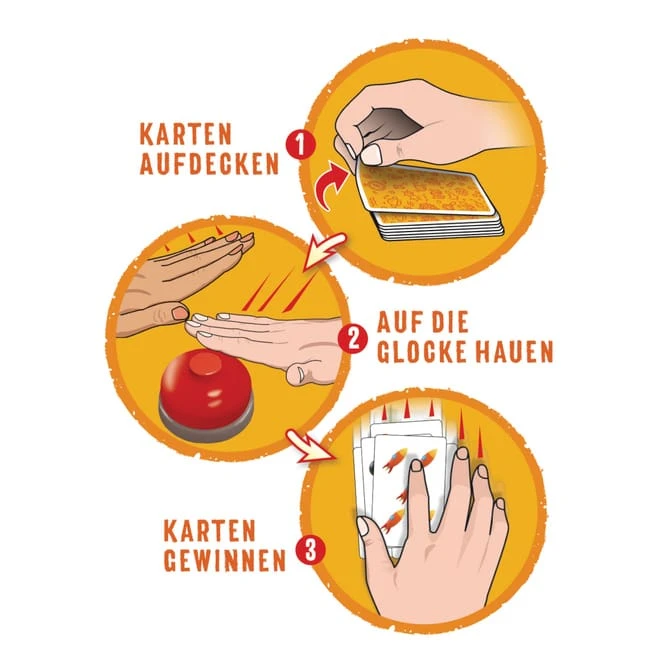 - Inhalt: 56 Spielkarten, 1 Glocke, 1 Spielanleitung